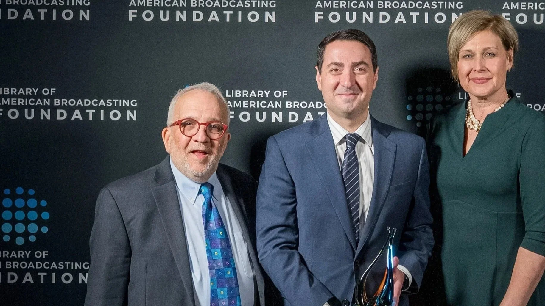 ABC News Radio National Correspondent Steven Portnoy (c) received the 2025 LABF Excellence in Broadcast Preservation Award for his outstanding dedication and commitment to promoting awareness to the importance of collection and preservation of broadcast history. The award was presented at the Giants luncheon in New York on Nov. 14. He is flanked here by LABF co-chairs Jack Goodman and Heidi Raphael.